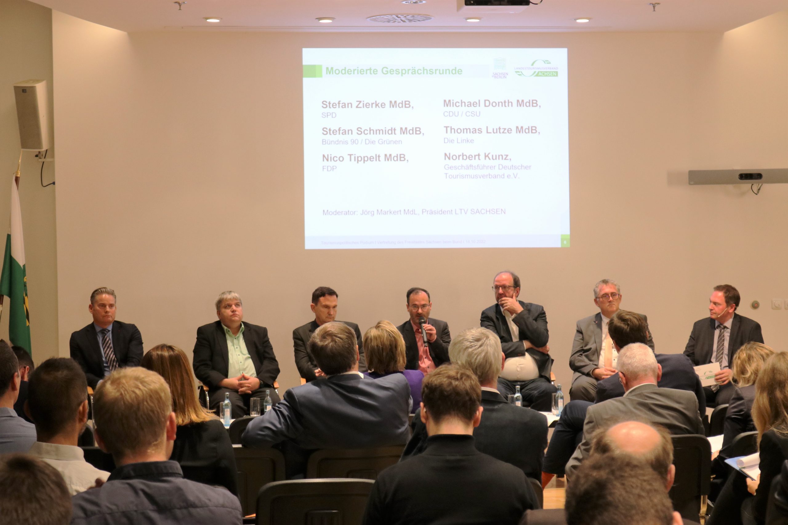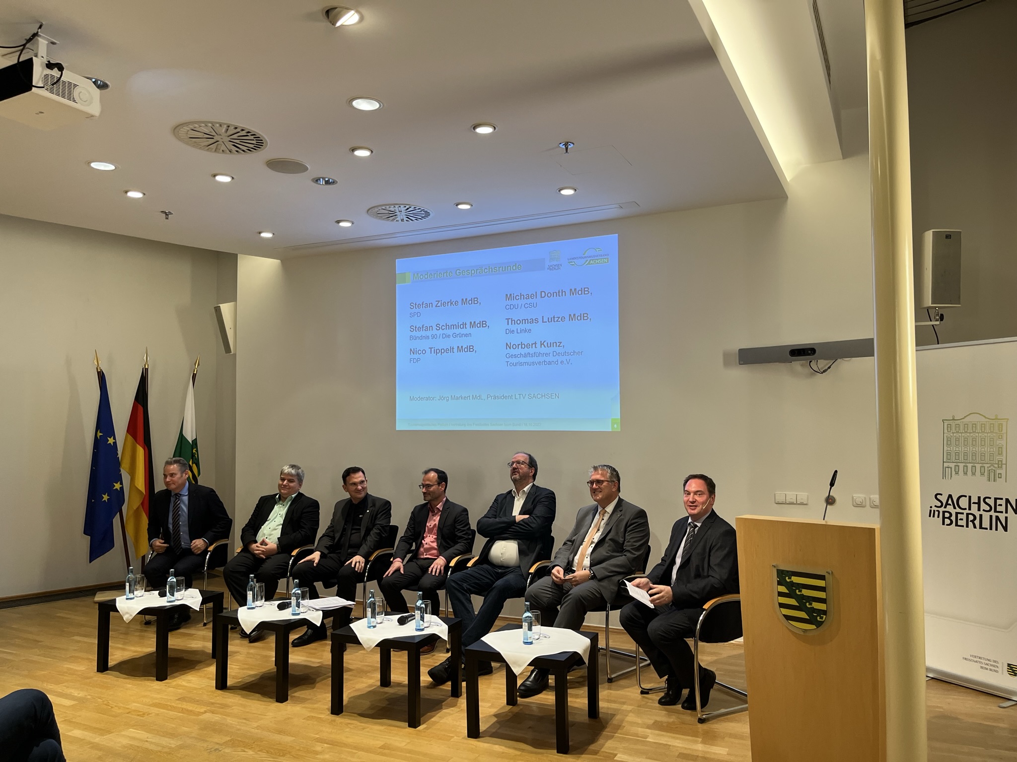 Herausforderungen und Trends wurden beim tourismuspolitischen Podium am 18. Oktober 2022 in der Landesvertretung Sachsen in Berlin diskutiert. Tourismusexperten von Bundestagsfraktionen sowie Claudia Müller MdB, Koordinatorin der Bundesregierung für die maritime Wirtschaft und Tourismus, waren am Austausch beteiligt. Neben der aktuellen Lage stand auch die Nationale Tourismusstrategie auf der Themenagenda.