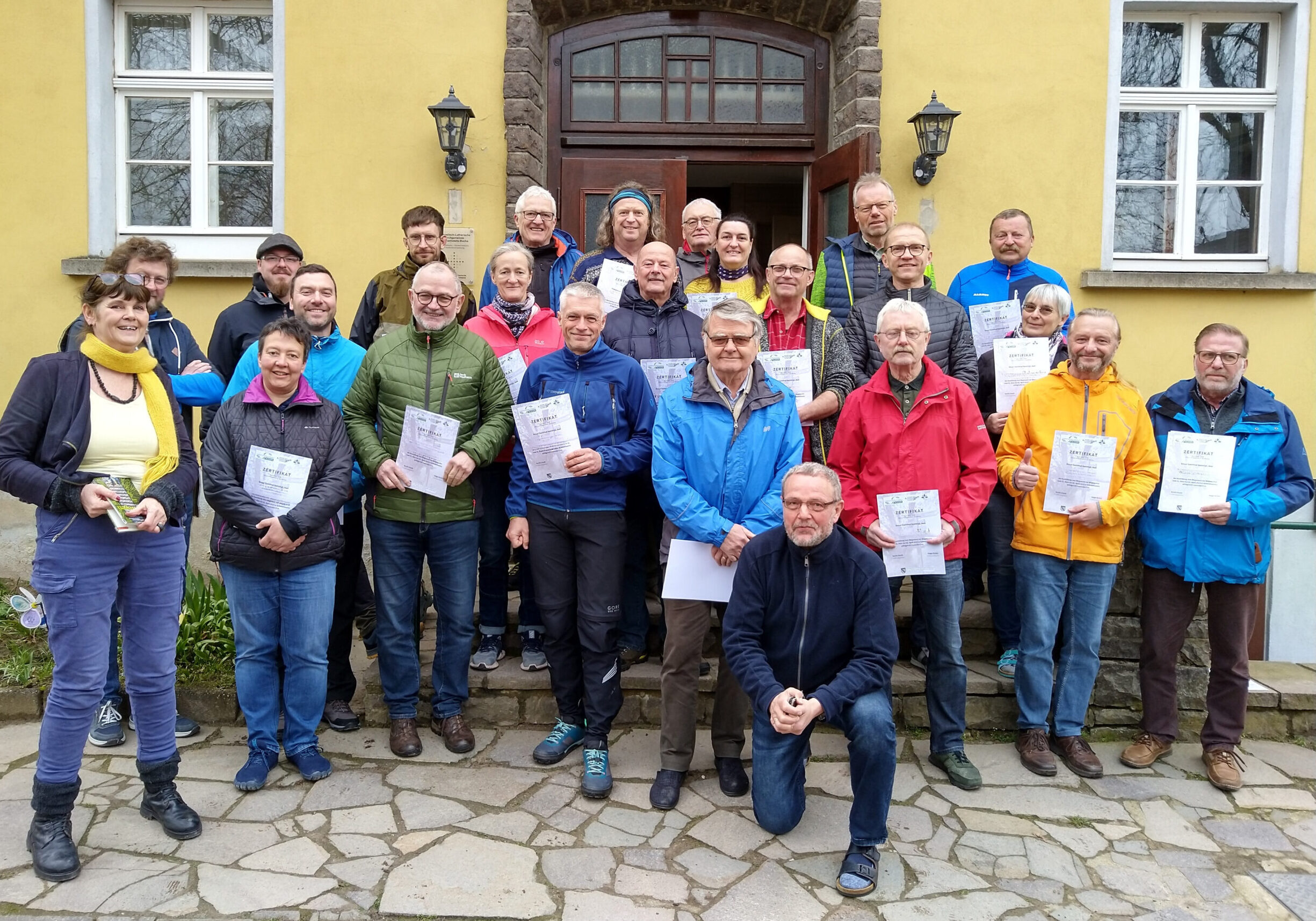 Absolventen mit Zertifikat der Wegewarteausbildung 2025 der Wandere- und Pilgerakademie Sachsen.